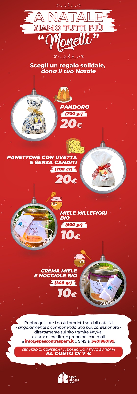 Aderisci alla nostra campagna, acquistando uno dei nostri prodotti enogastronomici solidali da regalare ai tuoi cari o da gustare sulla tua tavola durante le festività. Contribuirai al completamento dei lavori delle villette e del giardino di Via Monelli.