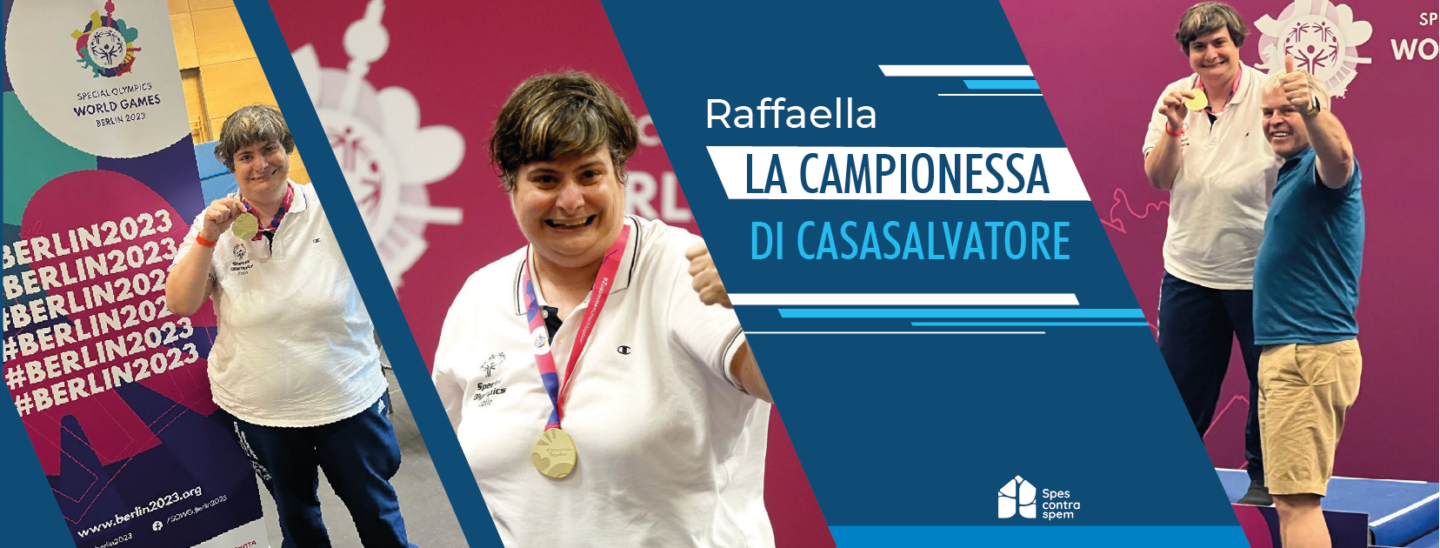 Se entri a CASASALVATORE, la casa famiglia per persone con disabilità medio-grave, e ti muovi per le stanze come in una caccia al tesoro, troverai in un cassetto due preziose medaglie d’oro dei Giochi Mondiali Special Olympics di Berlino 2023. Chi le ha vinte? Raffaella, romana verace, classe 1971, nuotatrice dai suoi 7 anni di età, sale sul podio due volte, per 50 mt stile libero e 25 mt dorso!