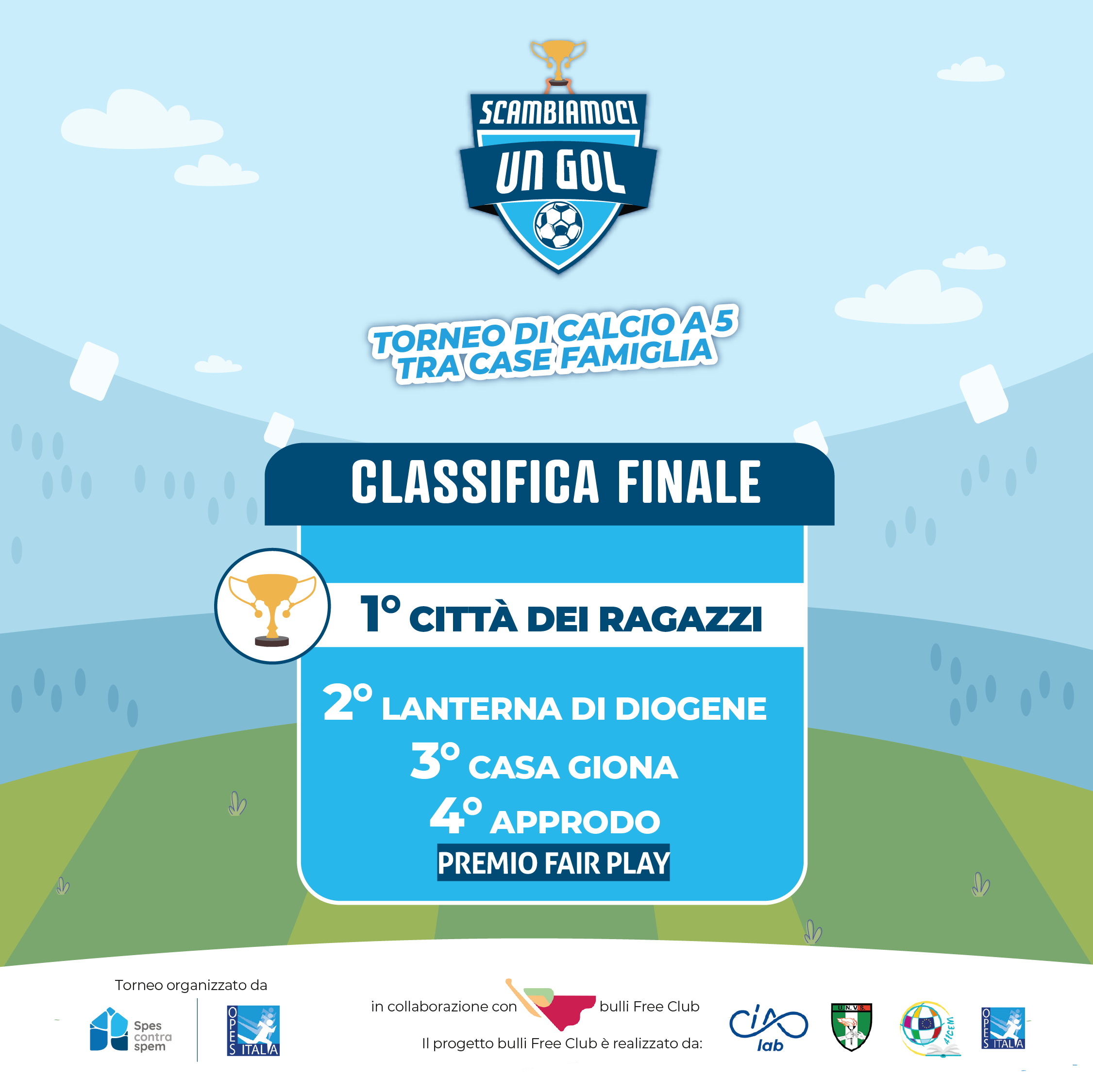 Il torneo è stato organizzato da Spes contra spem e Opes Comitato Provinciale di Roma in collaborazione con Bulli Free Club; ha coinvolto quattro squadre di altrettanti gruppi appartamento per minori a Roma: Casa Giona Caritas Roma, La Lanterna Di Diogene, Approdo e Opera Nazionale per le Città dei Ragazzi, a cui va il primo posto.